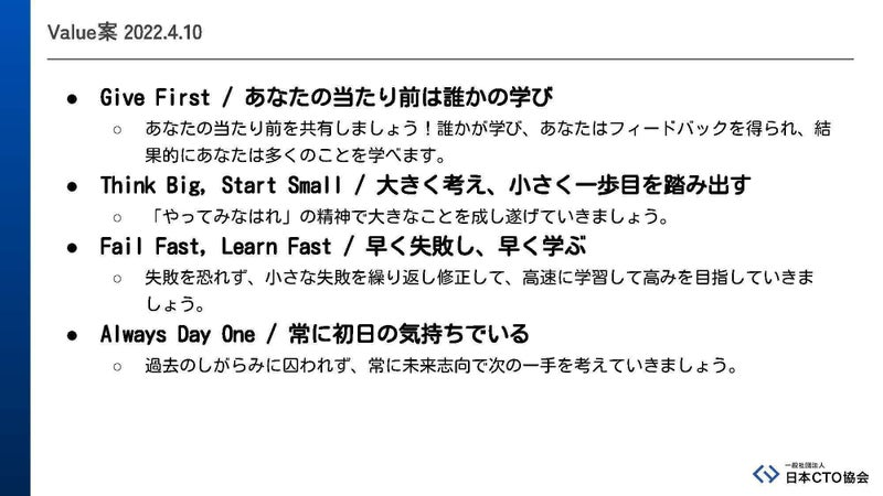 ということで改めまして、日本CTO協会のビジョンとバリューはこちらです。
