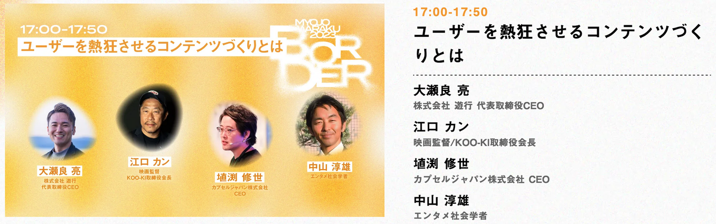 そんな中、代表の埴渕が登壇した「ユーザーを熱狂させるコンテンツづくりとは」というトークセッションには、昨年Netflixドラマで大きな話題となったドラマ「サンクチュアリ」や、映画「めんたいぴりり」などで監督を務めた江口カンさんと熱いディスカッションを交わす様子なども見られ、作品の大ファンである私は終始興奮しっぱなしでした。笑