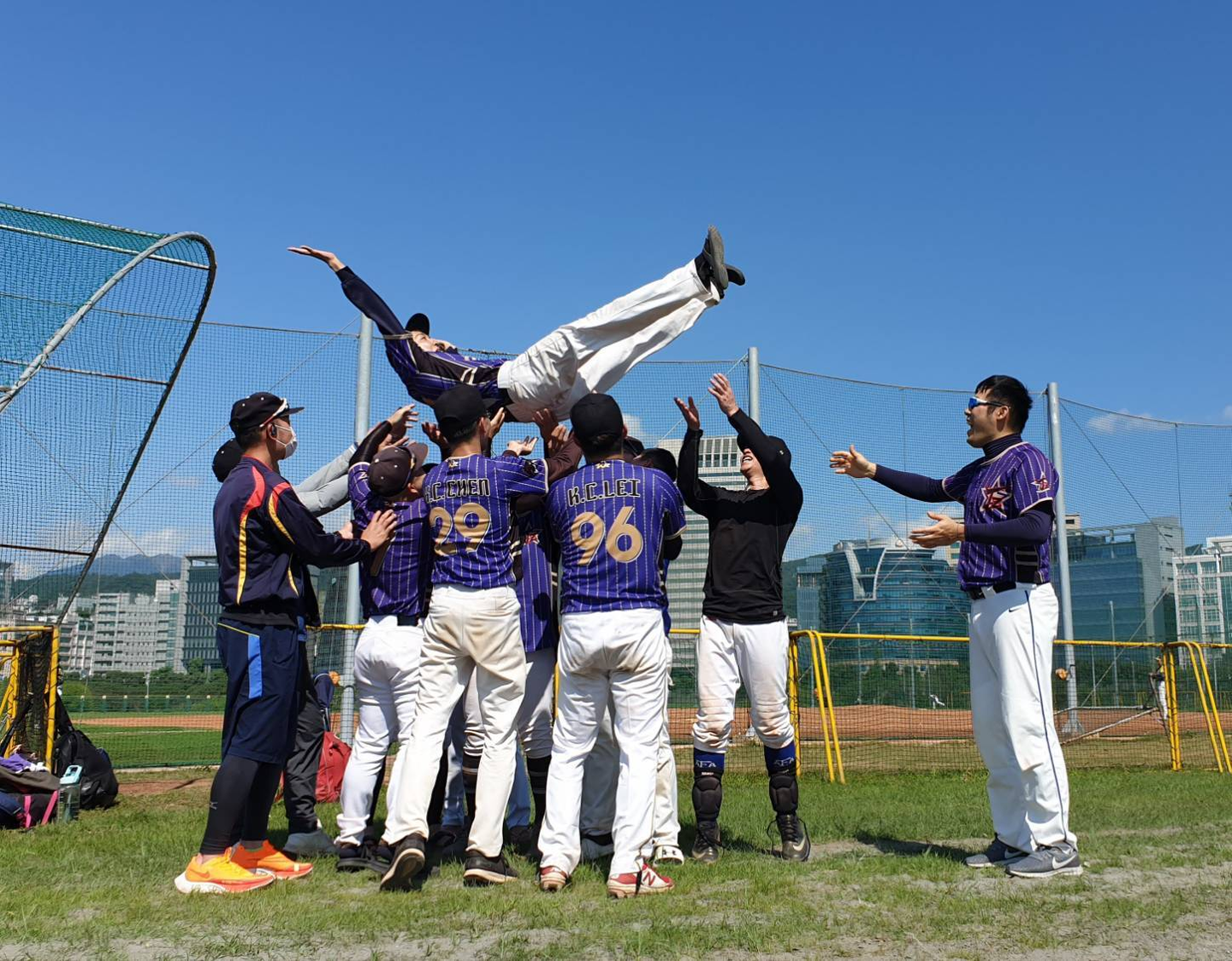 (台湾時代に所属していた野球チームJz。日本人は自分だけ。日本帰国にあたり最後は日本風にと胴上げされた。)