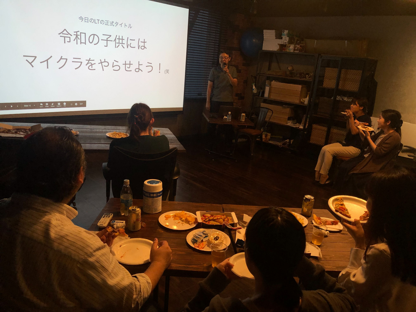 みんなでピザを食べながらLT大会中。登壇しているのは取締役です。