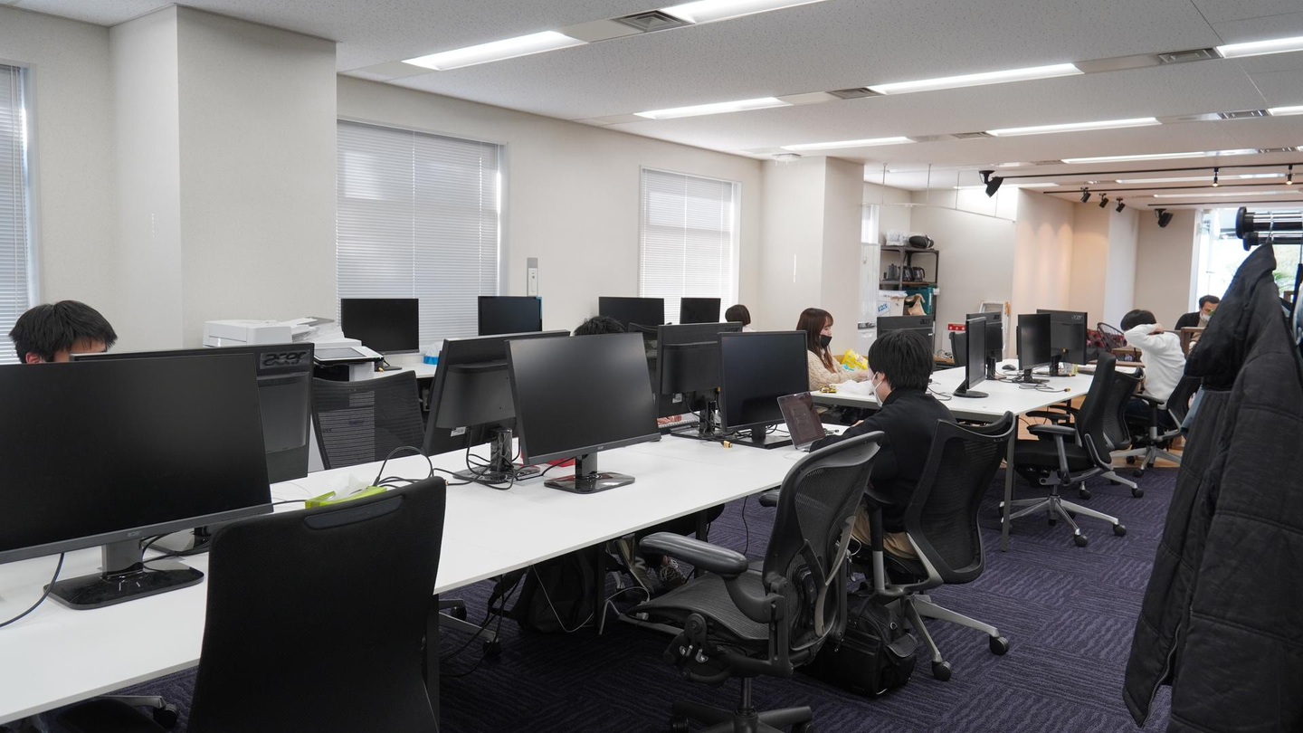カフェスペースの奥は執務室です。モニターが全ての席に配置されていて、椅子も疲れにくい物なので、長時間の作業にぴったりです。執務室もフリーアドレスで、席は決まっていません。