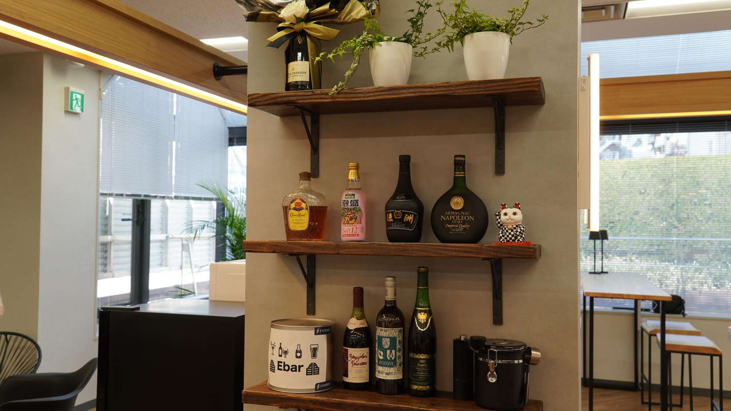 棚にはお酒が並んでいます。お土産に地方のお酒を買ってくる社員もいます。