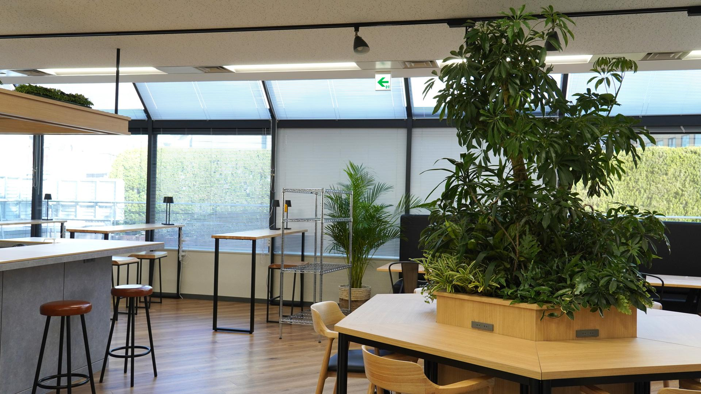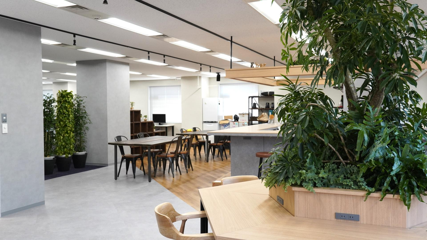 エントランスを抜けるとカフェスペースに入ります。真ん中にシンボルツリーを構えた一人席や、アイランドバー、カウンター席など、まさにカフェのような雰囲気。社員からも人気のスペースです。