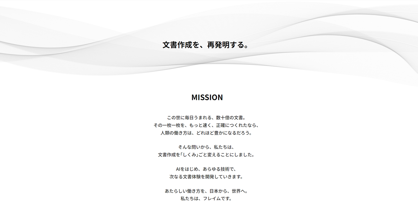 多くの企業、官公庁等での文書作業は今でも膨大にあります。それを削減し、作業自体を無くしていくことは、働く人のみならず、そこに関わるあらゆる人に多くのメリットがあります。FRAIMは、その大きな課題に向けて「文書作成を、再発明する」を目的に設立したスタートアップです。