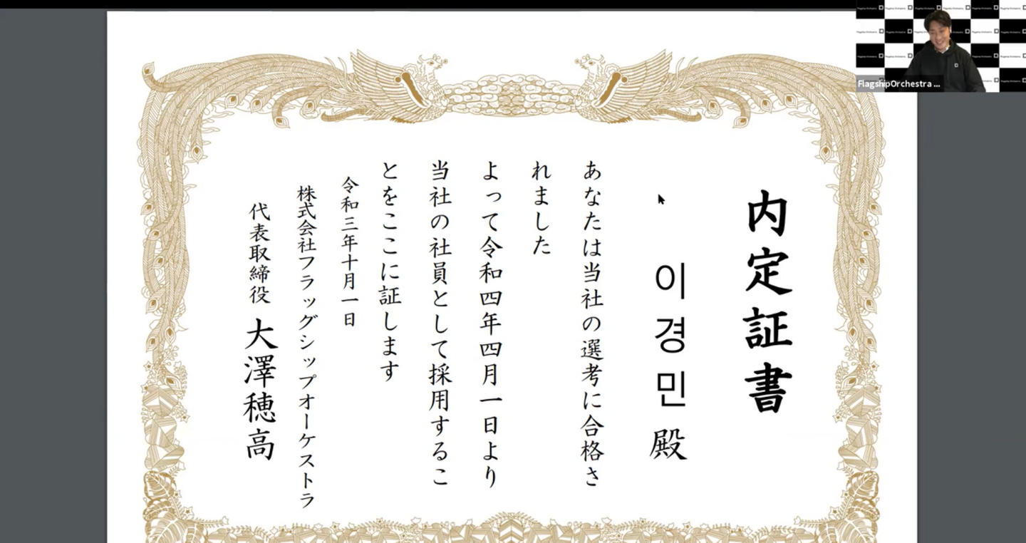 その後、内定証書授与式を行いました。オンラインでの授与式ですが、FSOメンバーからの心暖かい拍手と共に代表 大澤から内定者へと贈られました。