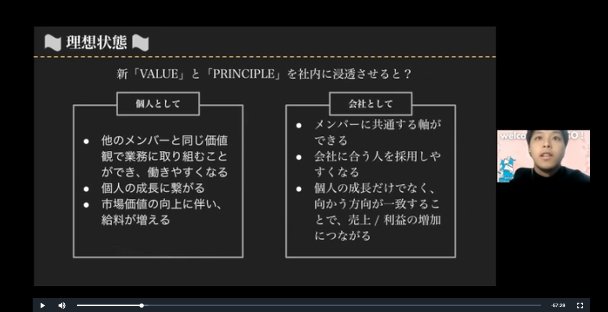 目的としては、「同期同士の一体感」、「新卒発信のカルチャー醸成」になります。1ヶ月という短い時間の中で素晴らしいアウトプットを出してきてくれたので、非常に感動しています・・! 実際に提案してくれた施策は今期1年間、人事と22卒でプロジェクト化して動かしていく予定です。