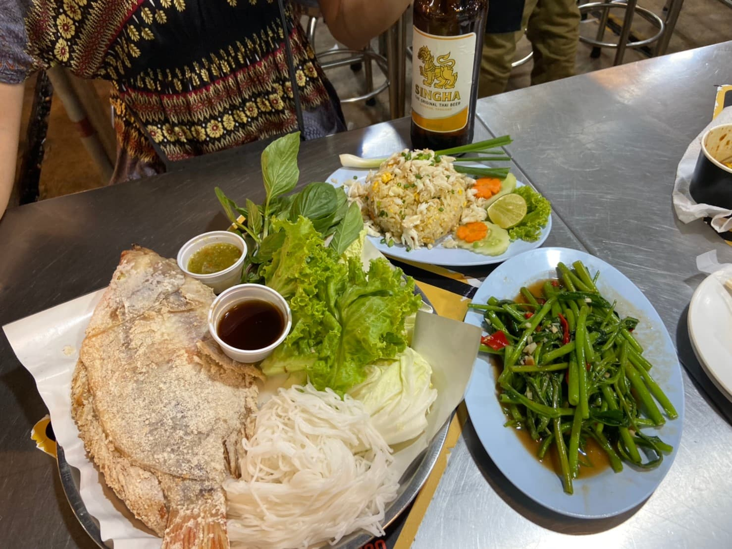 1日の疲れを癒す夕食タイムです。タイビールは欠かせません。