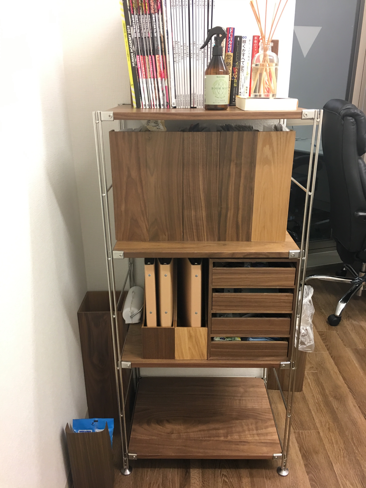 ラックを始め、棚、書類立て、ブックエンド、ゴミ箱…様々な家具を木目調に揃えてみたり、居心地の良い椅子を調べたり、サイズ感の丁度いい棚を探したり…。