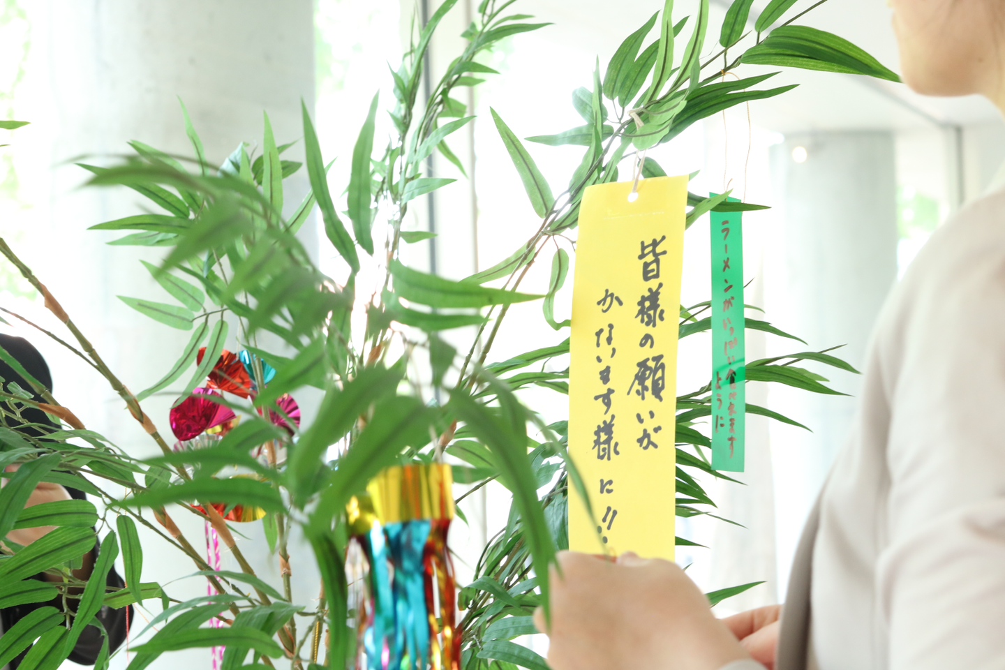 笹にはスタッフそれぞれのお願いが込められた短冊が飾られています。