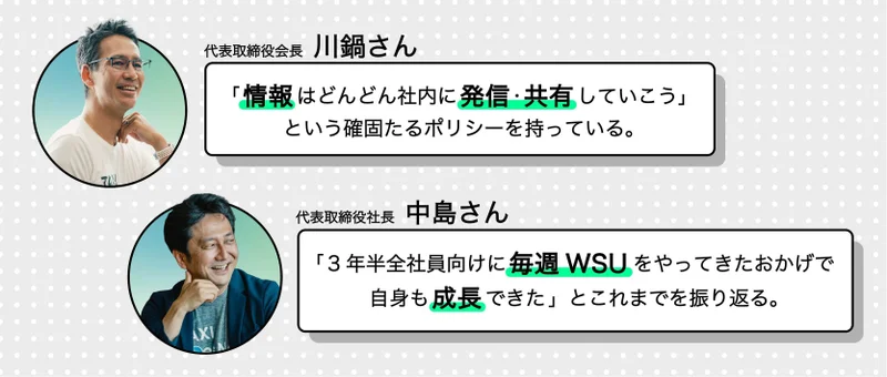 そんな状況のなかでWSUは“どんどん情報発信をしていこう”という両代表の想いからオンラインで実施するようになりました。今となってはWSUがあることで組織内で積極的に情報共有していく風土ができていたり、放っておいたら遠くなりがちな代表との距離も毎週顔を見ることによって近く感じられているという効果がありました。これからも組織に最適化した情報共有の形を追求していきたいと思います。