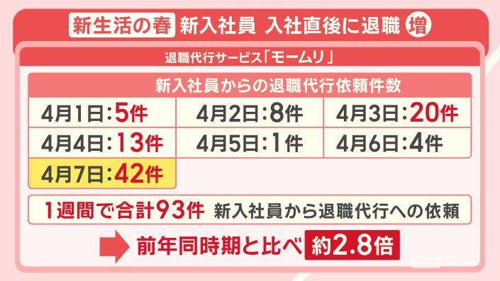 退職代行サービスを行っている『モームリ』では、4/1から約1週間で、新入社員からの依頼が93件もあったそうですΣ(・□・;)