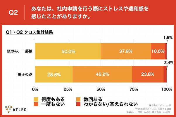 ・社内申請にストレスや違和感を少しでも感じたことのある人は紙:87.9%、電子:73.8%
