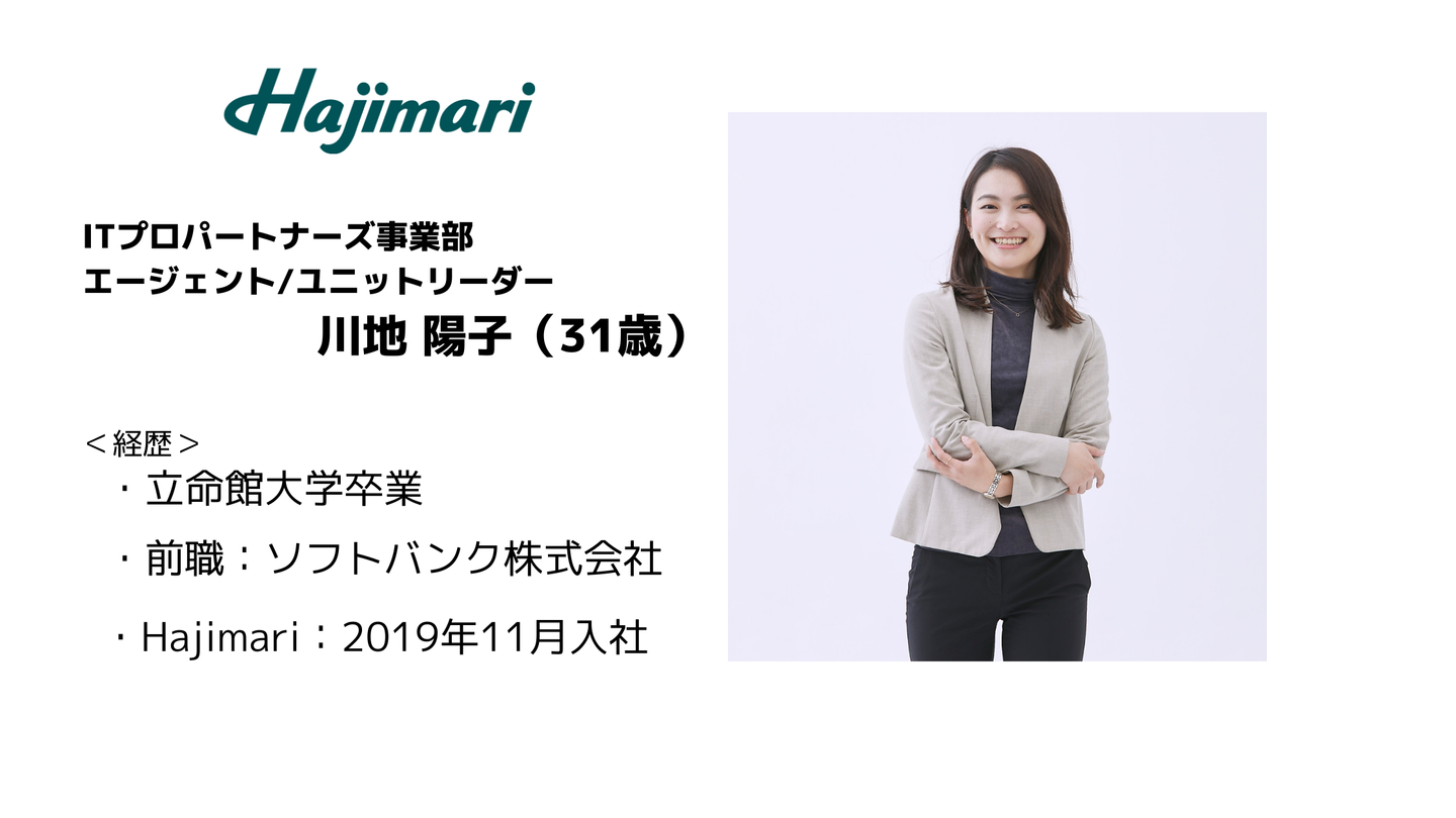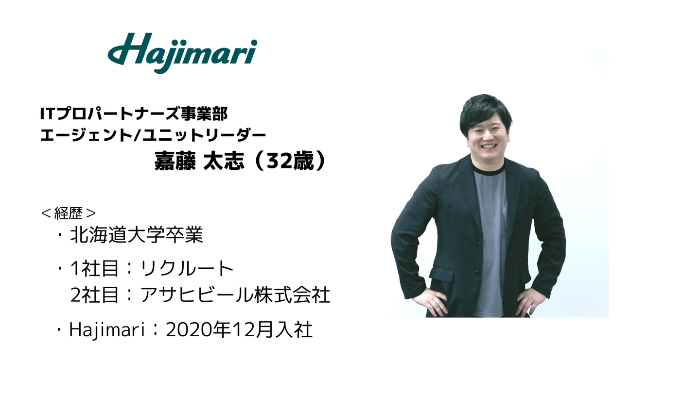Hajimariへ入社をしてからは、ITプロパートナーズ事業部でRA/CAの両面を担っており、今はユニットリーダーと言う立場を任してもらっているので2名のマネジメントもしています!