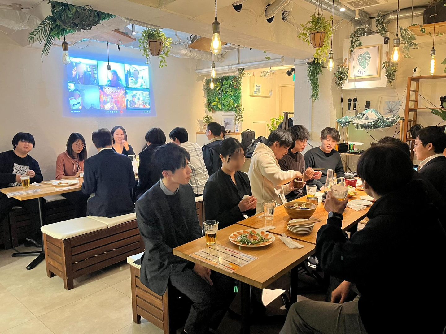 オンライン組は、懇親会会場のプロジェクターに接続して、オフライン組もオンライン組もその場で同時に会話しているような、ライブ感が楽しめるものでした!