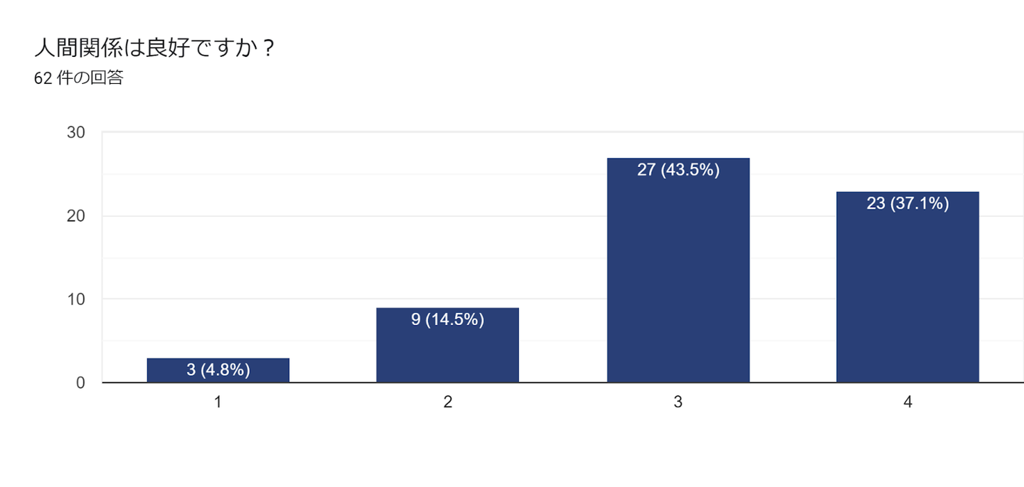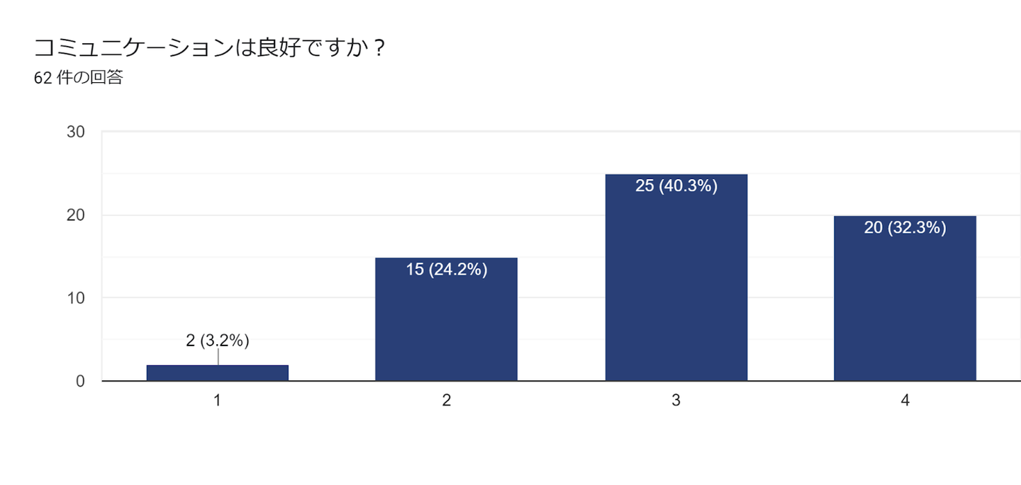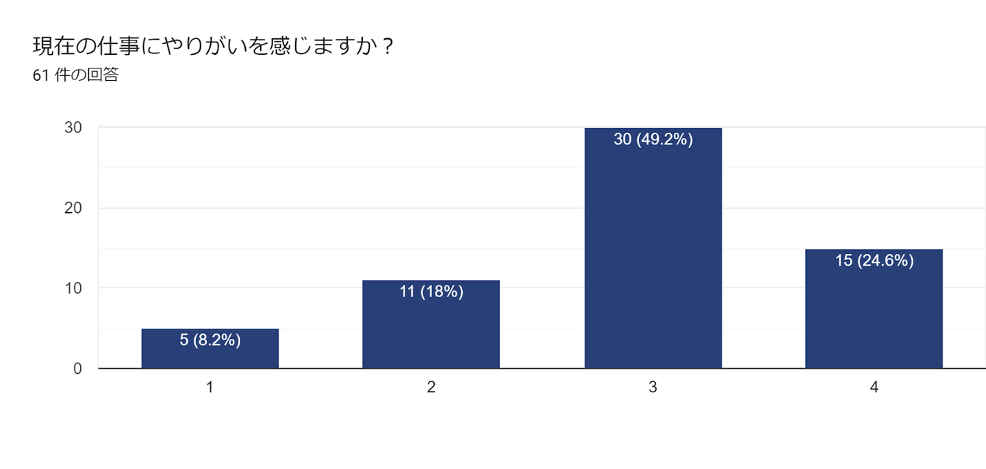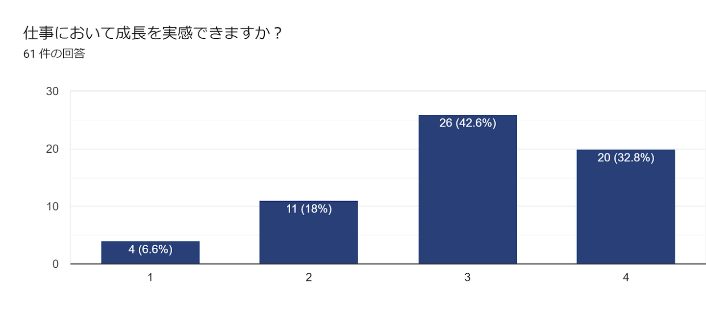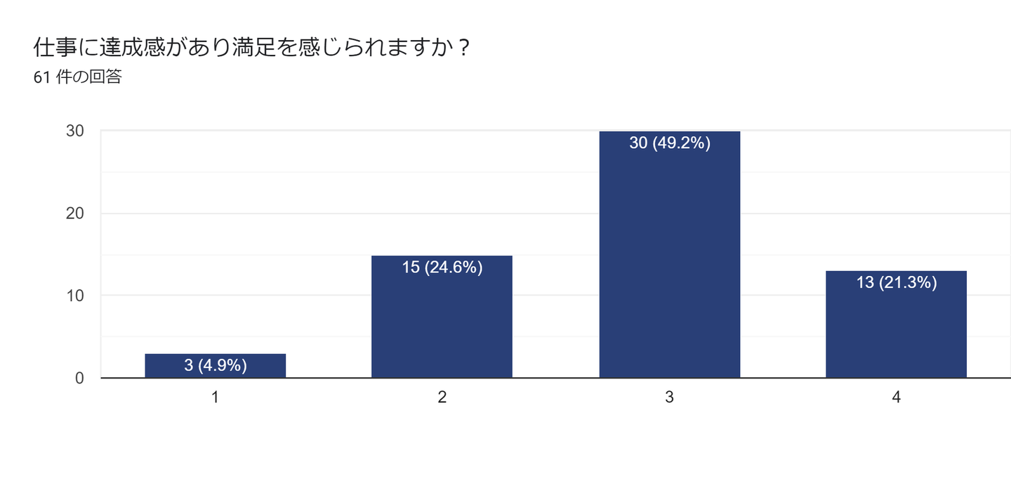 一方で30%弱の従業員が、やりがいや達成感を感じることができておらず、参画する社外案件などにも大きく左右されるポイントなのかな?と分析しています。