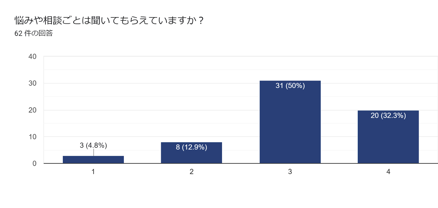 人間関係に関係する質問ですが、人間関係が良好と回答している従業員80.6%、悩みや相談ごとを聞いてもらえている従業員82.3%と比較すると、コミュニケーションについては良好と感じる従業員は72.6%にとどまりました。