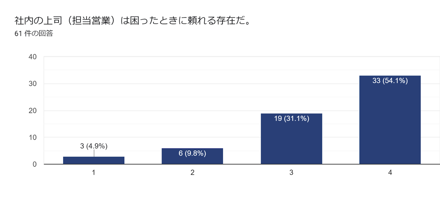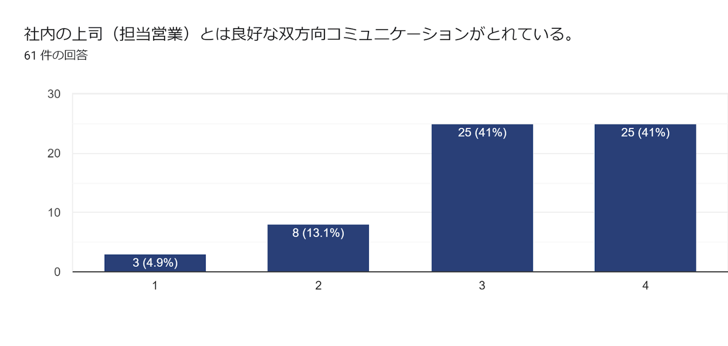 非常に頼れる存在だと回答している従業員が54.1%にものぼり、全体で85.2%の従業員が上司や担当営業を頼れる存在だと感じている結果になりました。双方向コミュニケーションについても82%の従業員が良好と感じてくれている結果になりました。