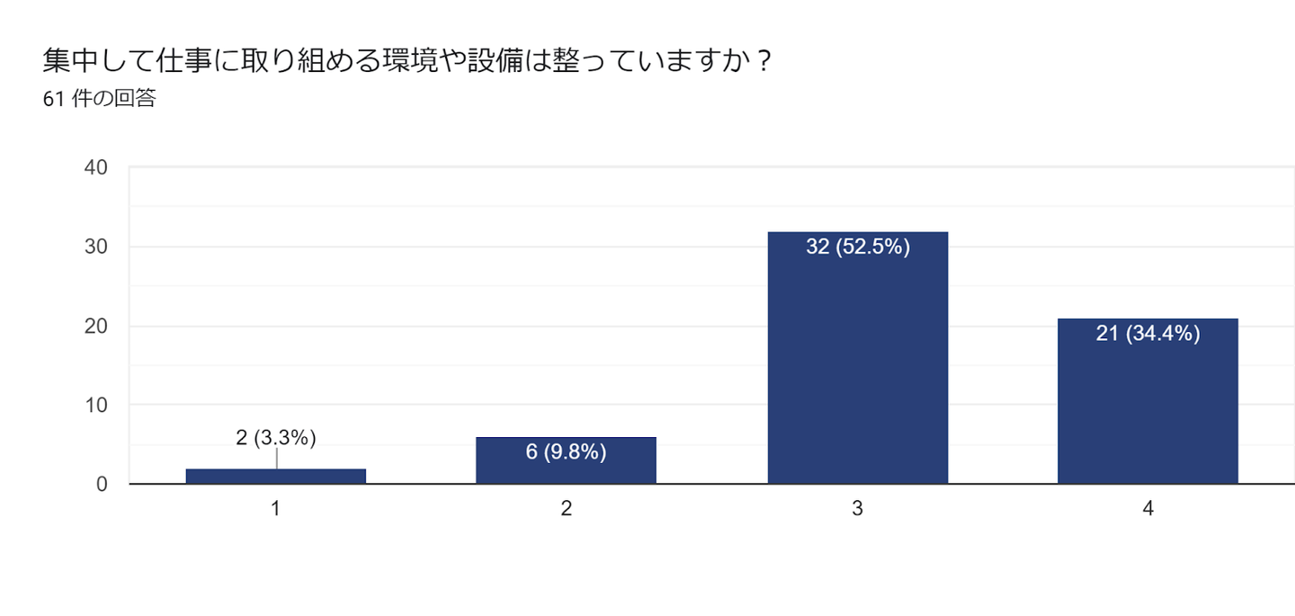 86.9%の従業員が整っていると感じている結果となりました。在宅・リモートワークも多く、PCなどは社外の参画先などから借りられたりという背景も大きいと分析しています。