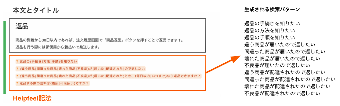 2つ目が、検索内容と回答ページを結びつける「質問文」の作成です。それぞれの回答ページにおいて、ユーザーがどのようなキーワードで検索するか、適切な言い換え表現を加えます。ユーザーと情報を結びつける大事な導線となり、Helpfeelの検索性の肝となる部分です。