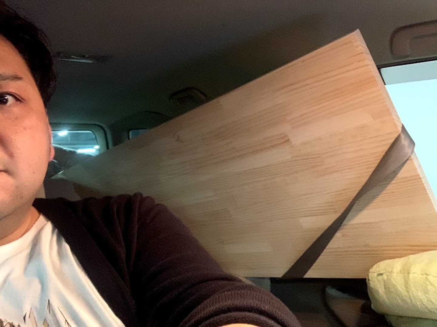 ホームセンターで「190cm × 90cm」のパイン材の集成材を購入し切り出してもらいました(切り出しは数百円)。ギリギリ車に積んで持ち帰ることができましたが視界も狭くなるためこれで都内を走るのはコワイです。DIYの最初の障壁として材料をどうやって持って帰るかがあると思いますが、ホームセンターでは軽トラが無料でレンタルできるところも多いですし、最近は通販で任意のサイズの板を注文も出来るので自分にあった入手方法を探してみてください。