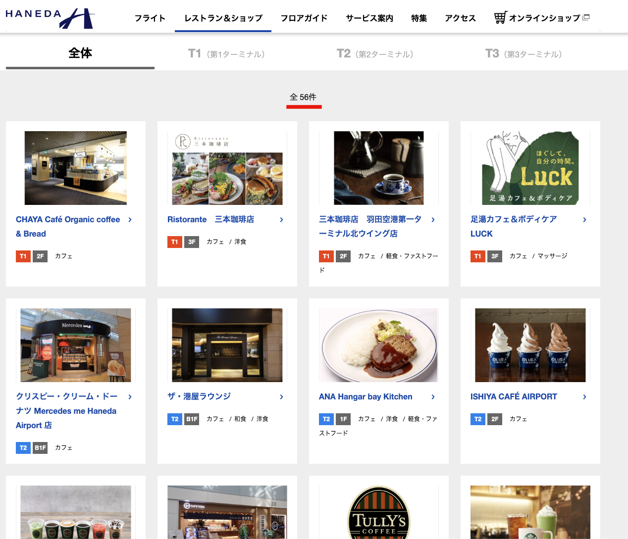 羽田空港のレストラン検索 で検索した様子。羽田空港には56件のカフェがあるようです。ただしコーヒースタンドやお土産屋さんなど作業スペースがない店舗もたくさん出てくるので注意