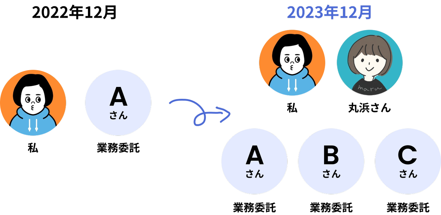 マーケティング部のデザイナーは、2022年末の時点ではフルタイム(私)と業務委託の方の2名だけでした。そこから2023年はフルタイムが1名と、業務委託の方が2名増えて合計5名に。