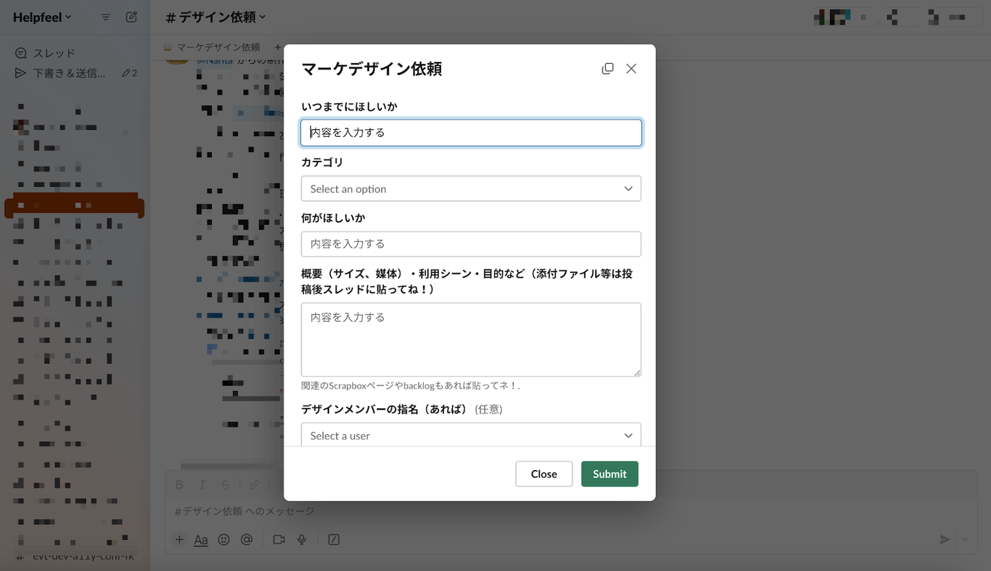Slackのワークフロー機能を利用し、#デザイン依頼 チャンネルに依頼を集約、そこからデザイナーをアサインしたり、backlogを立ててタスク管理ができるようにしました。
