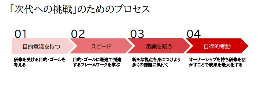 そのため、ビジョンからブレイクダウンした4つの行動指針にそった研修内容が行われました。