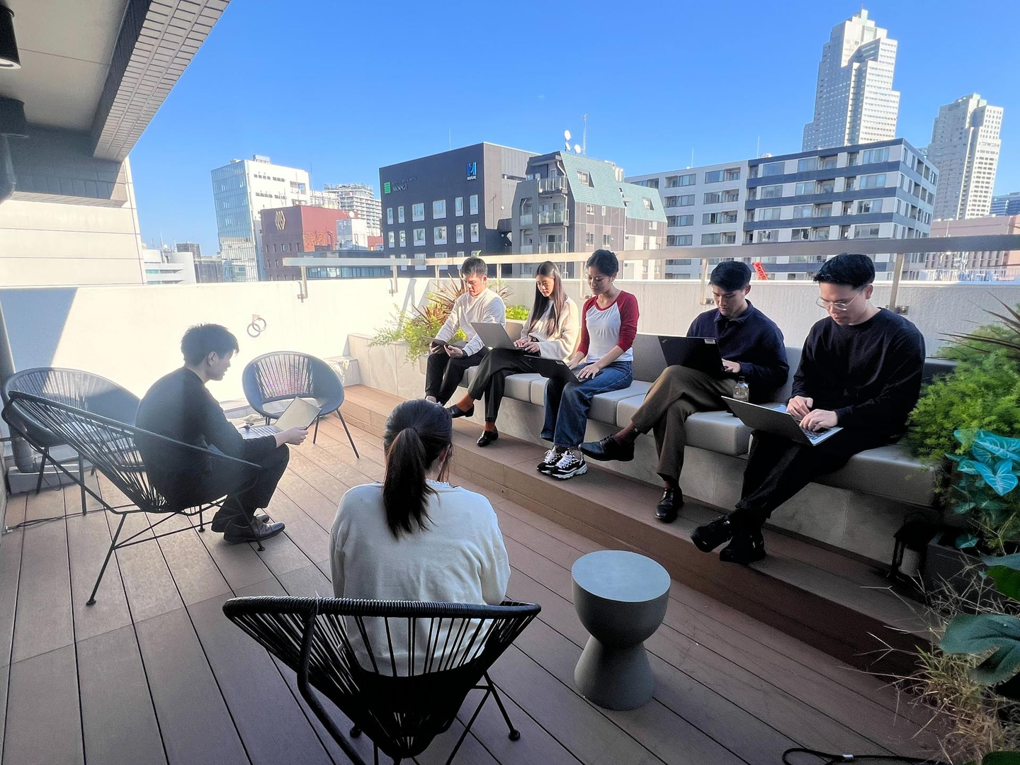 天気の良い日には、ここでリフレッシュしながら休憩したり、チームでミーティングを行ったりしています。