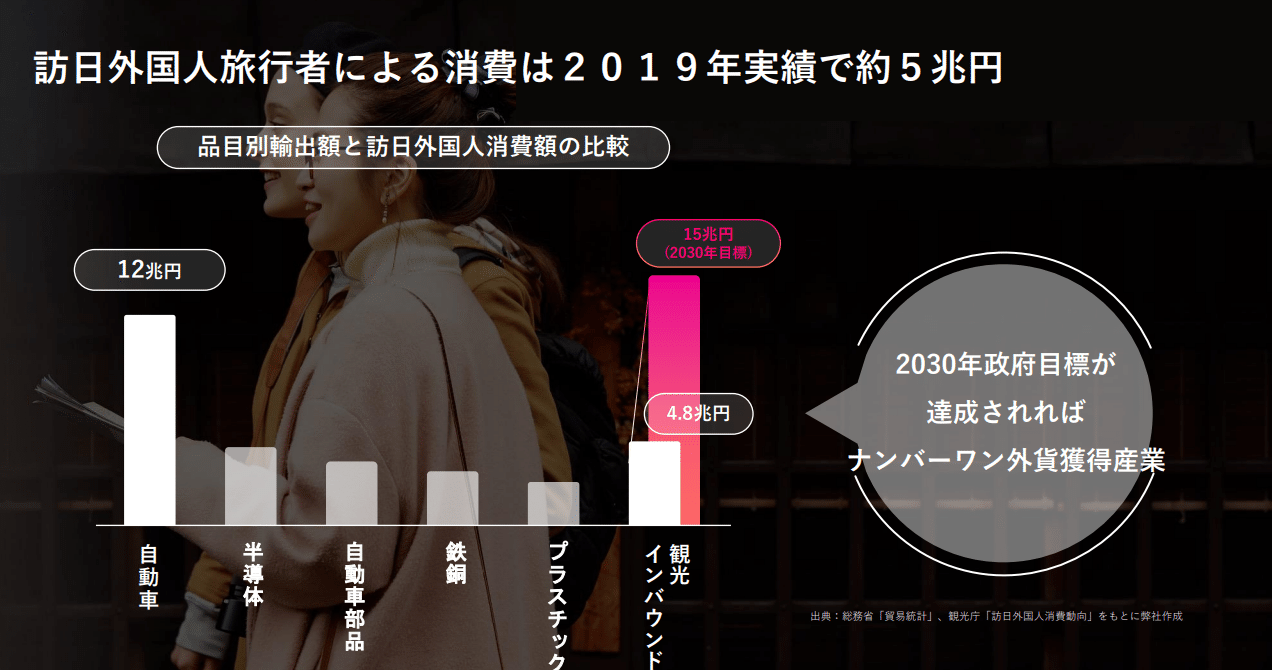 さらに、経済産業省が発表しているデータでは、2019年と2023年を比較して、訪日インバウンド旅行消費額がなんと2億円増加!市場規模は自動車産業を超える規模にまで成長する可能性があるとも言われています。