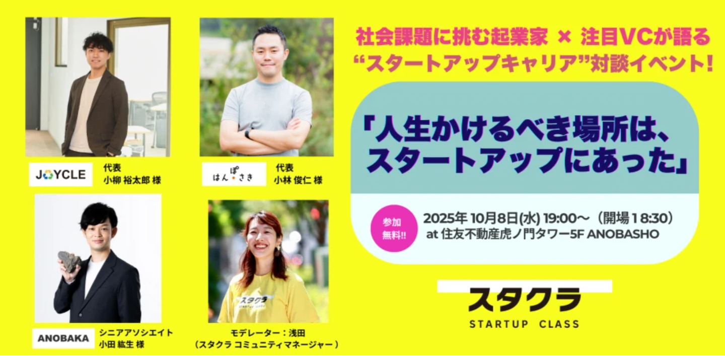 2025年10月8日(水)、ANOBASHO(住友不動産虎ノ門タワー5F)にて、スタートアップクラス主催のキャリアイベント「社会課題に向き合い続ける起業家×注目VC、3者が語るキャリア。」が開催されました。JOYCLE代表・小柳裕太郎は、“安定よりも、自分の手で社会を変える面白さを選ぶ”というテーマのもと、創業に至る背景と、JOYCLEのチームづくりについて語りました。
