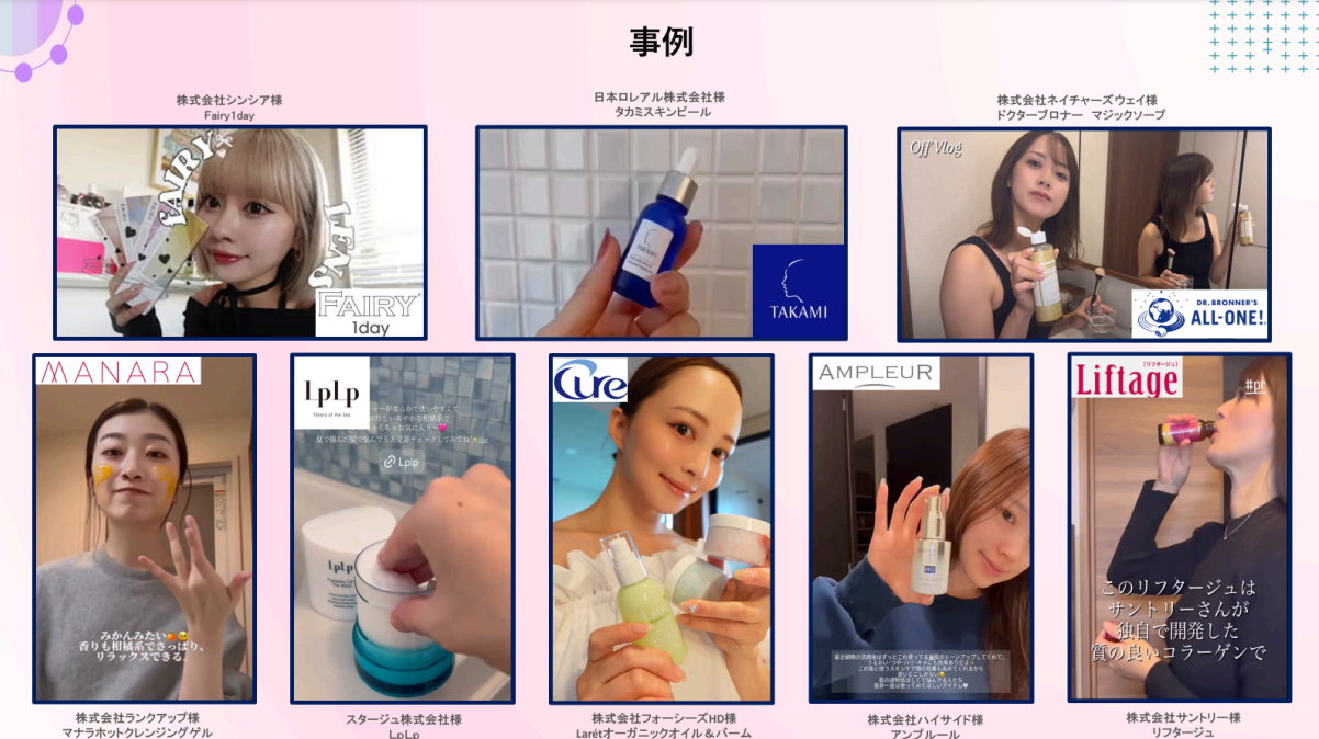 当社では、インフルエンサーを選定する際に、業界における権威性やブランドとの親和性はもちろん、豊富な分析データを用い、単なる製品紹介を超えて、ブランドメッセージを強力に伝える役割を担ってもらっています。インフルエンサーによる製品体験やレビューは消費者にとって非常に説得力のあるコンテンツとなり、購買意欲を高めます。また、インフルエンサーとのコラボレーションを通じて、消費者とブランドとの接点を増やし、より強力なコアファンを育てることができます。