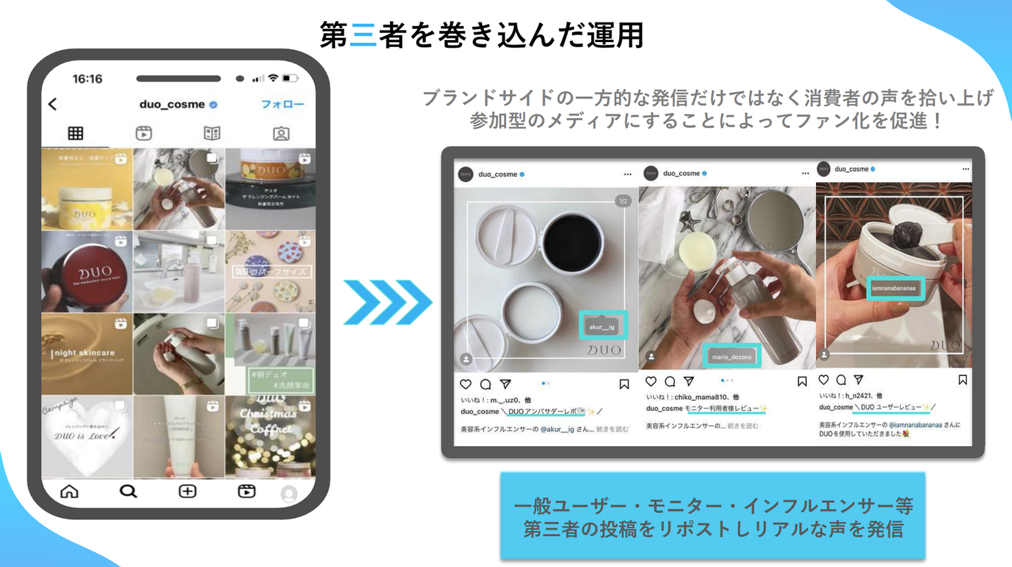SNSマーケティングにおいて、企業が自社アカウントを運営することはもちろん大切ですが、それだけでは限界があります。そこで重要なのが第三者を巻き込んだアカウント運用です。企業のアカウントに第三者(インフルエンサー、業界のエキスパート、ユーザーなど)を巻き込むことで、アカウントの信頼性や多様性を高め、ターゲット層へのリーチを広げることができます。