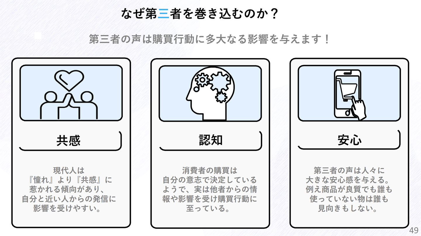現代のマーケティングは、消費者の信頼を得るためには単に企業からの一方的なメッセージだけでは十分ではありません。SNSを活用したマーケティングは、より深い信頼関係を築くための有力な手段となりますが、その成功の鍵は第三者の力を如何に上手く活用するかにあります。
