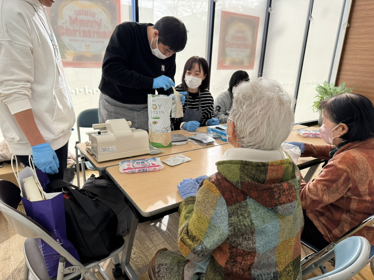 会場には実際に製造に携わっている事業所の利用者(※)も出席し、仕事内容を説明しながら訪れた人にプロテインの計量を体験してもらいました。