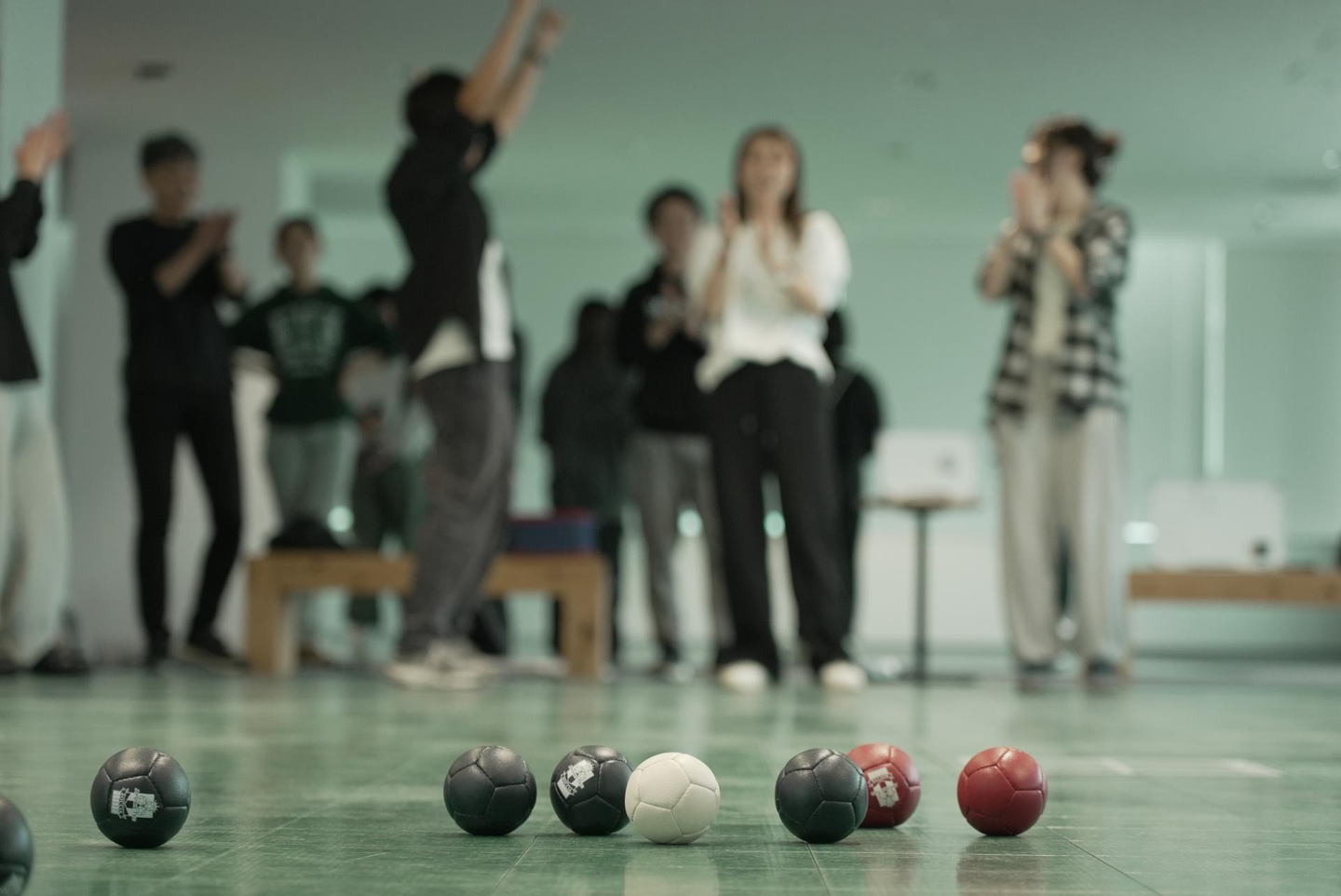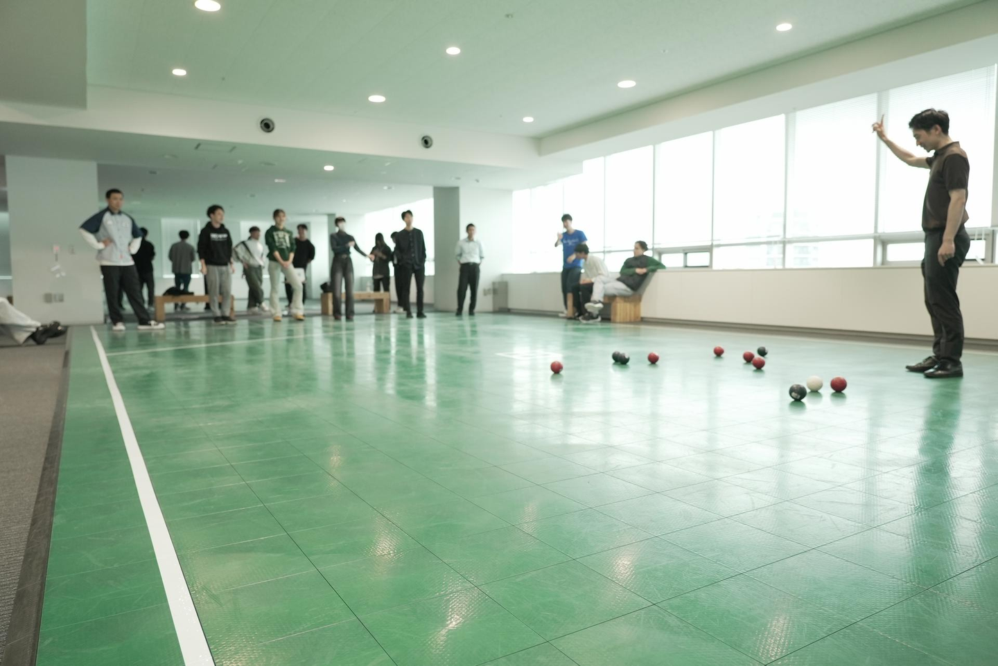 ヨーロッパで生まれた競技で、重度の脳性まひや四肢重度障がいのある人でもプレーできるように設計されています。白いジャックボール(目標球)に向かって赤・青それぞれのチームがボールを投げたり転がしたりして、どちらが近づけるかを競います。