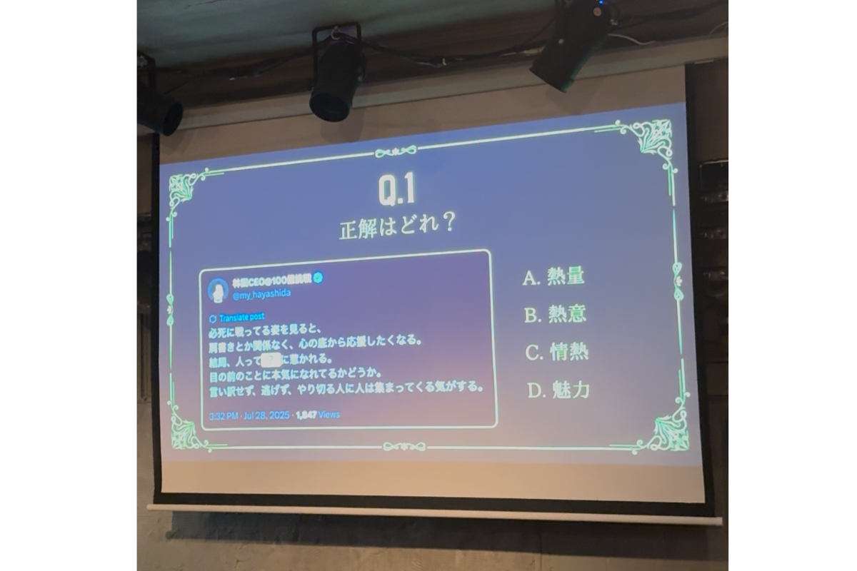 「社長を題材にするのアリ!?」とツッコミが飛び交うなか、本人も「いや、これ自分でも難しい!」と笑いながら見守り、会場は爆笑の渦に。みんな代表のXはしっかりチェックしているので正解者多数!