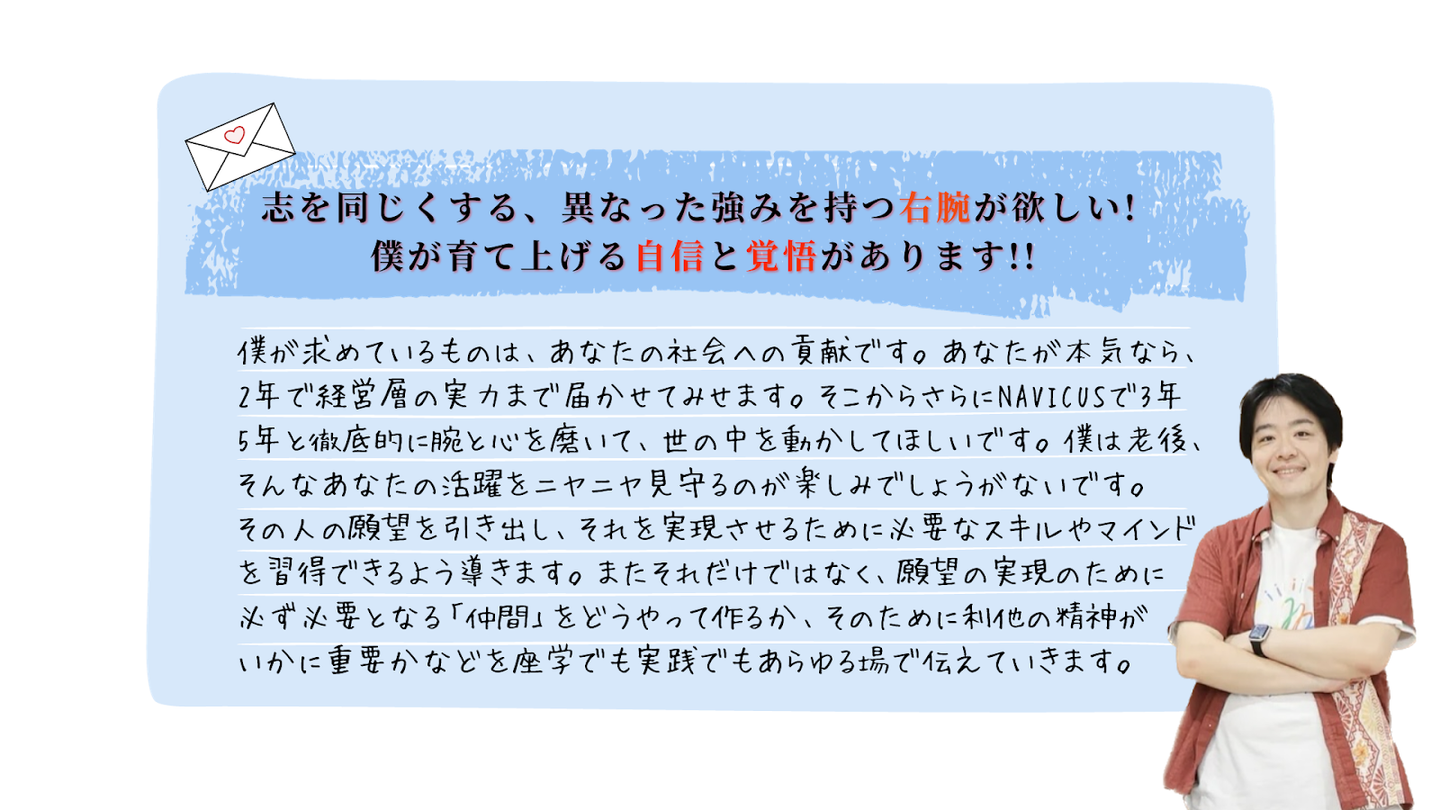 代表の武内から直接スキルを学び、2年後に経営メンバーとしてNAVICUSを、ひいては世の中を動かしていく...…そんなスピード感・環境で、私たちと一緒に成長していきませんか?✨