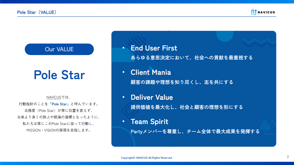 さて、2025年3月に第9期を迎えたNAVICUSは、MISSION・VISION・行動指針(Pole Star)を改定しました。