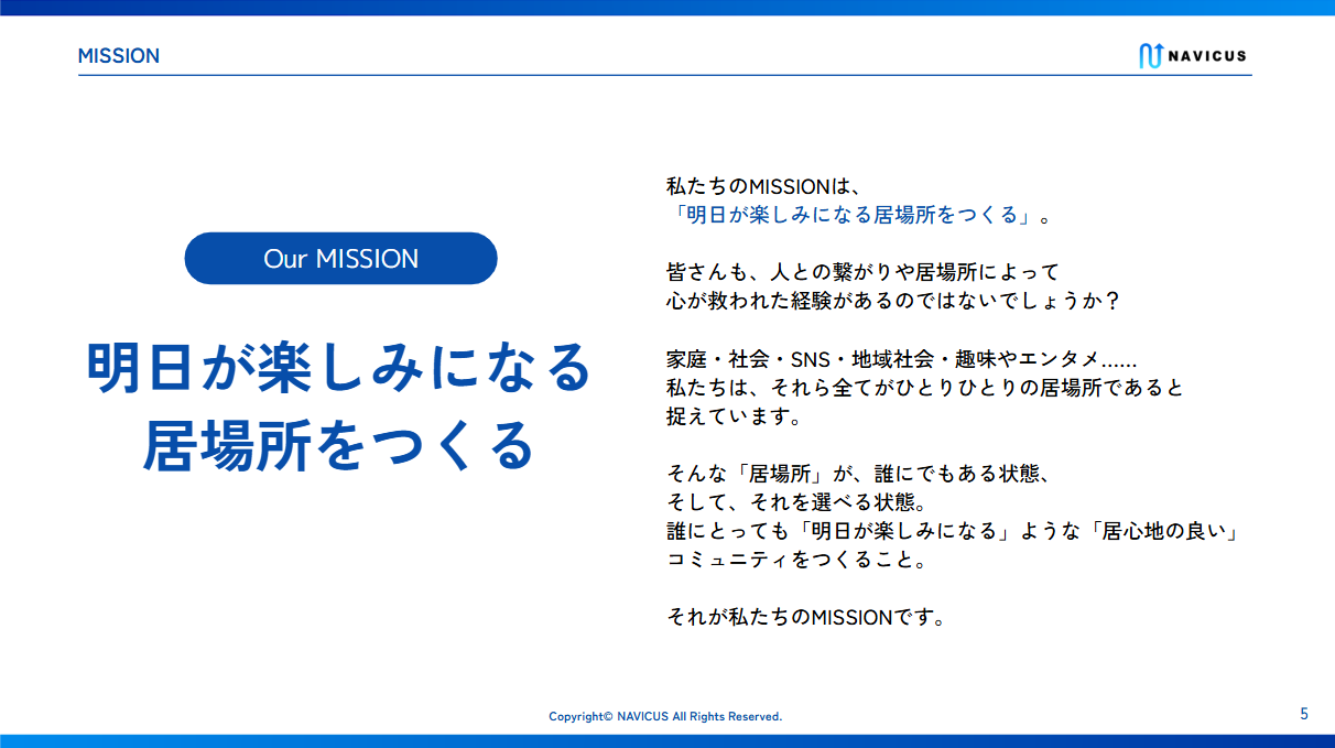 NAVICUSは、家庭や職場・SNS・地域社会・趣味など、誰かとつながるすべての場を一人ひとりの「居場所」と捉え、それらをより良いものにすることが社会の発展につながると考えています。
