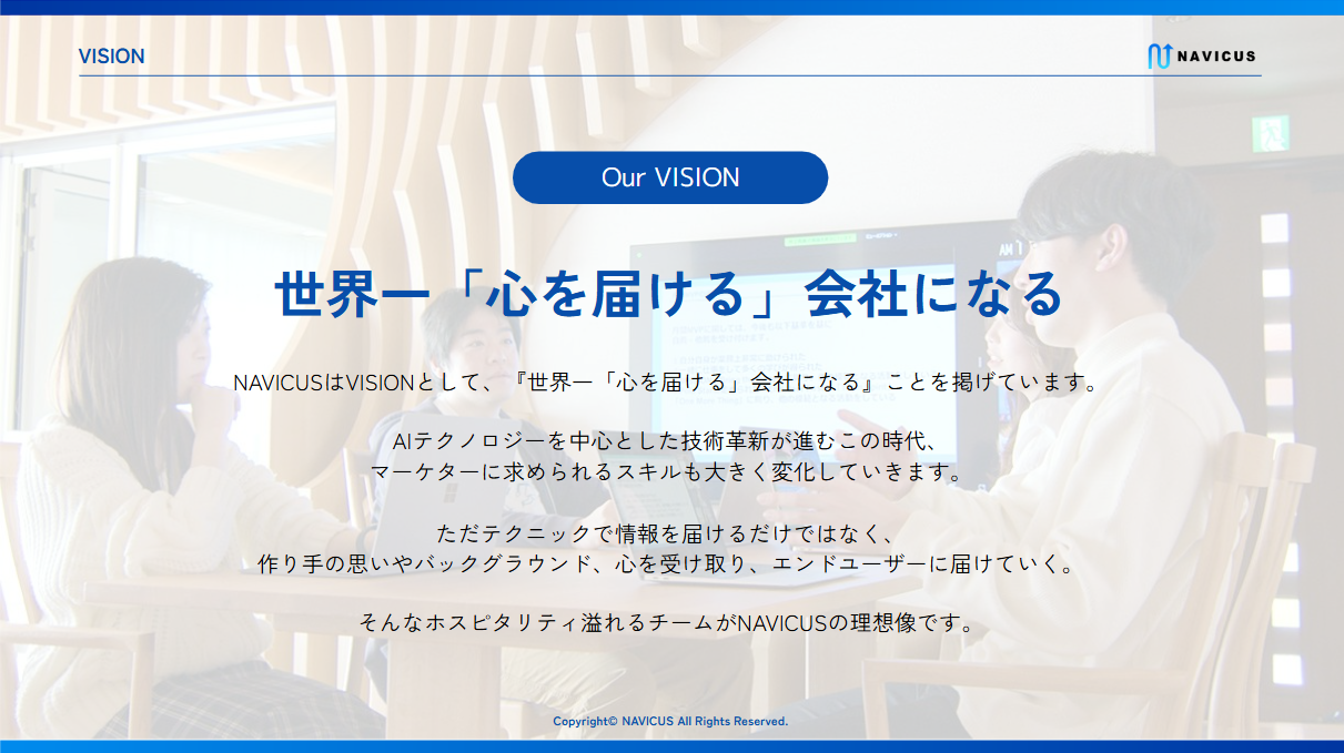 技術が進化するこの時代においても、NAVICUSは、人ならではのホスピタリティを大切にするチームを目指していきます。