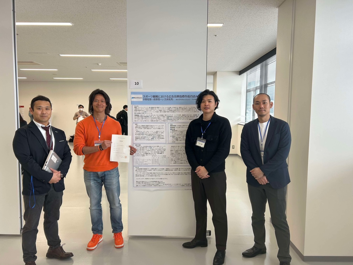 私を含め弊社のメンバー3名(万井、佐藤、宇野)が現地参加し、発表しました。「スポーツ観戦における広告効果指標作成の試み」というタイトルで、スポーツ観戦中における広告主側のスポンサーシップの定量的、かつ定性的な投資対効果を脳波計を用いた調査・分析に関する研究について発表を行いました。