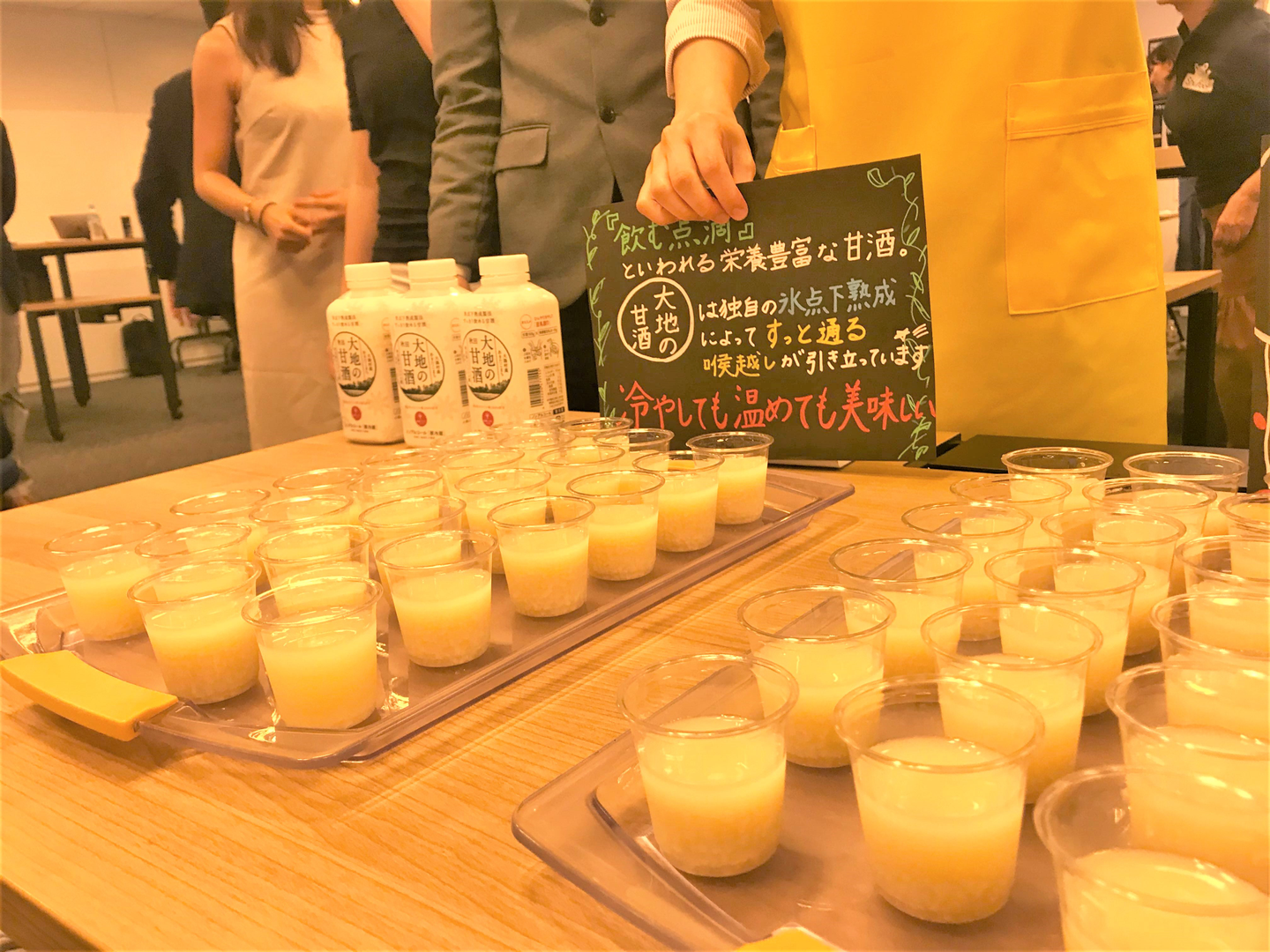 試食販売にて、食育をご提案されているソフィアプロモーションさんのセッション中には、本来は夏場に飲むのが最適だ、という甘酒が振る舞われました。