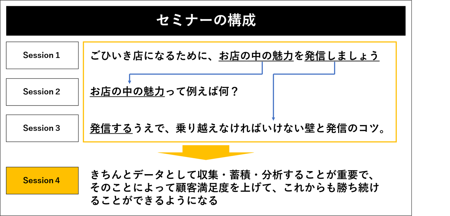 会場の皆さんがセミナーを一気通貫で聞き終わると、違和感なく自分の中に答えがある状態を作るために、セミナー全体を通じて1本のストーリーになることを意識しました。