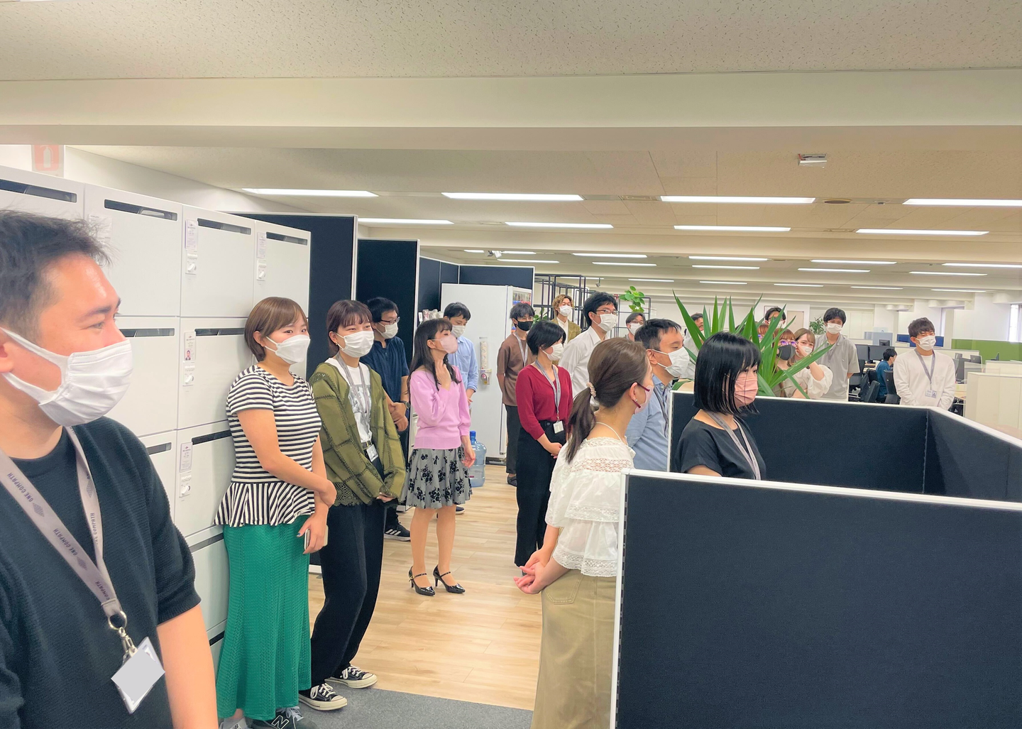 メンバーは経営陣、人事、内定者に加えて、社員全員が参加可能。仕切りのないオープンスペースで行いました。