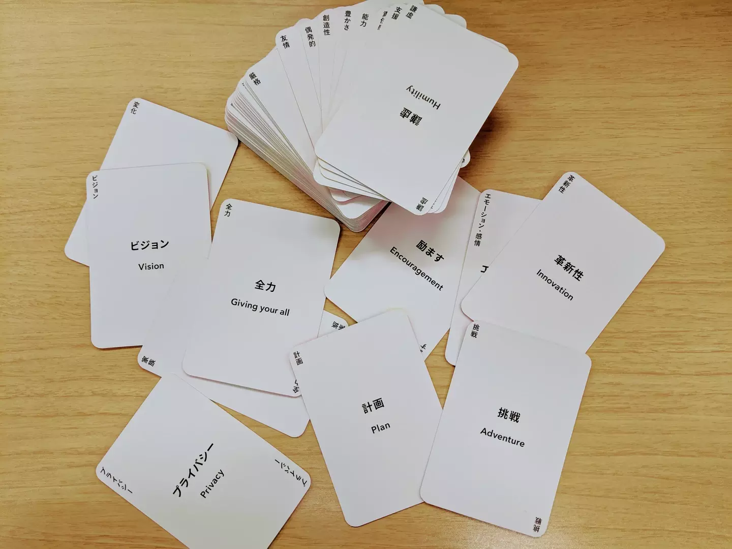 バリューカードとは、それぞれ異なる価値観が書かれた90枚のカードを使って、価値観をシェアし合うゲームです。