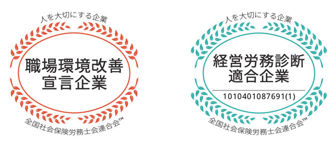 今回、職場環境の改善に取り組む企業が自ら宣言することで認定される「職場環境改善宣言企業」と、経営労務診断基準に基づき必須項目のすべてが適正と認められた企業「経営労務診断適合企業」の2つに同時に認定されました。