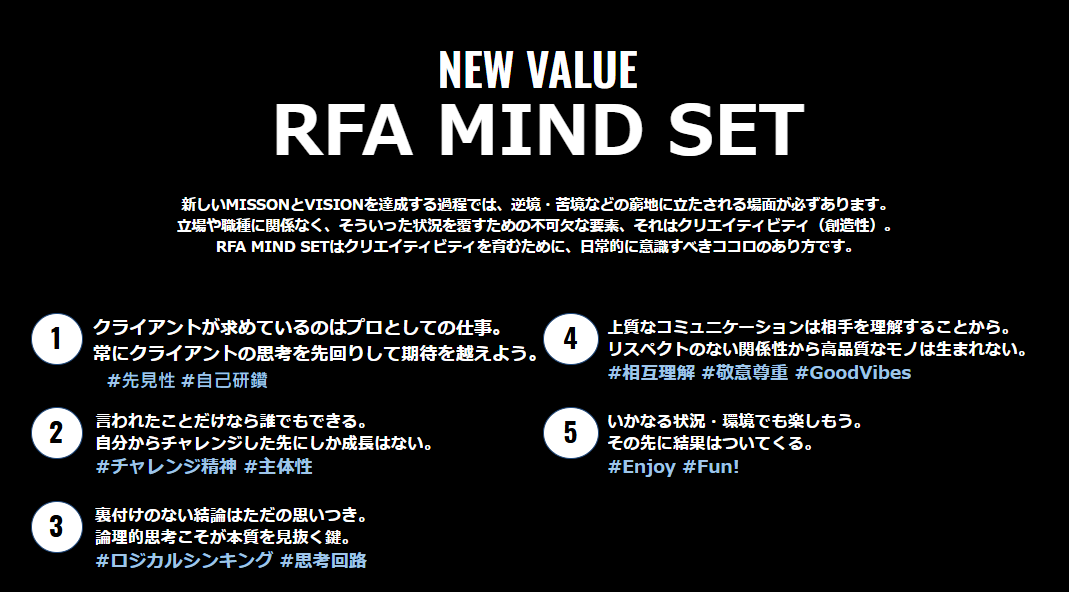 2023年12月、私たちはRFAの「ミッション・ビジョン・バリュー」を新しくしました。新しいミッションの「世の中の期待に全力で答える、“なんとかする”。」には、クライアントの課題解決に真正面から向き合い、期待以上の成果を出すという強い意志があり、社内でも一番浸透している価値観です。これは、RFAの社名の由来でもあり、創業時から大切にしてきた「result for all(結果を全てに)」という理念を、より具体的に、そして昇華させたものです。「“なんとかする”。」という想いは、社員一人ひとりの行動指針となり、クライアントへの成果、ひいては社会全体への貢献に繋がっていくと信じています。