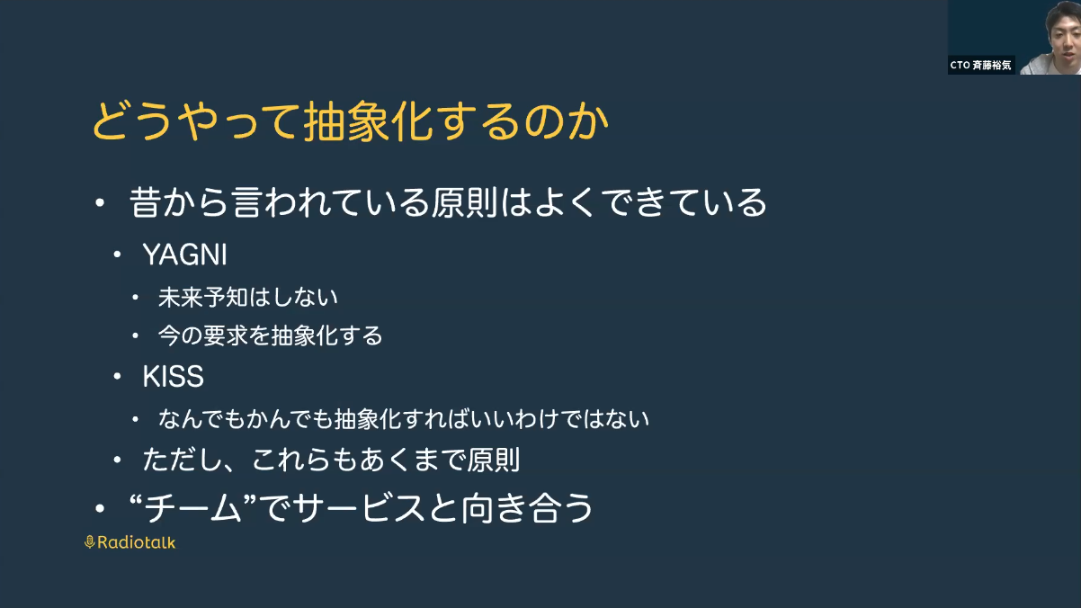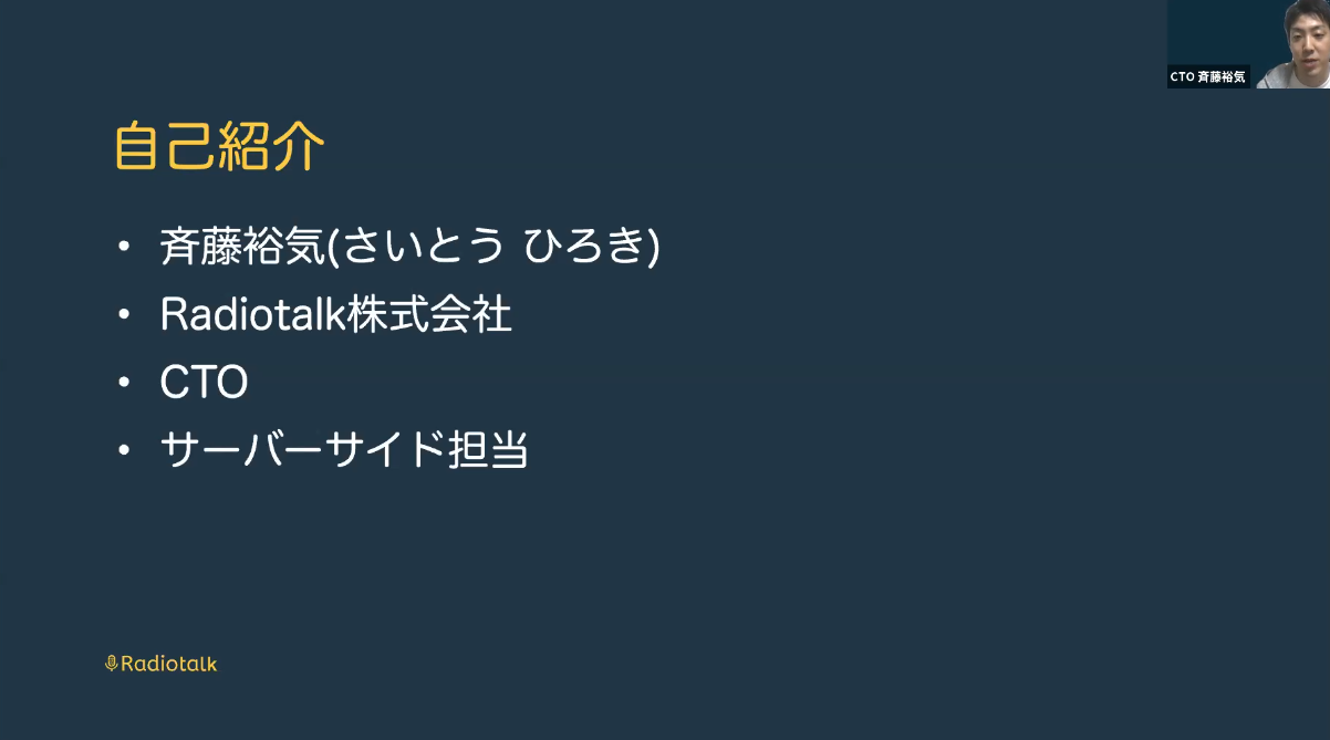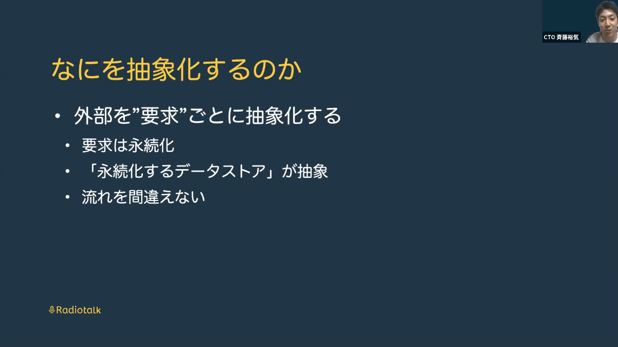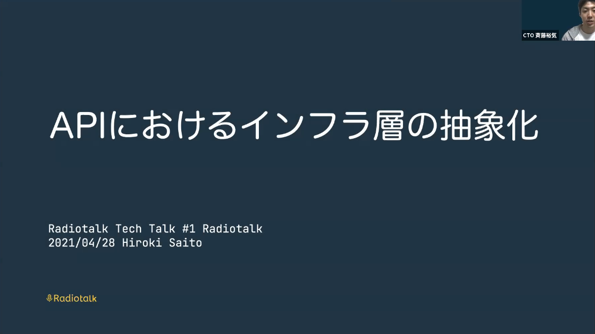 続いては、Radiotalk株式会社 CTOの斉藤裕気による「APIにおけるインフラ層の抽象化と実例」。Radiotalkの基盤を支えるサーバサイドの設計における「抽象化」の取り組みについてお話しました。