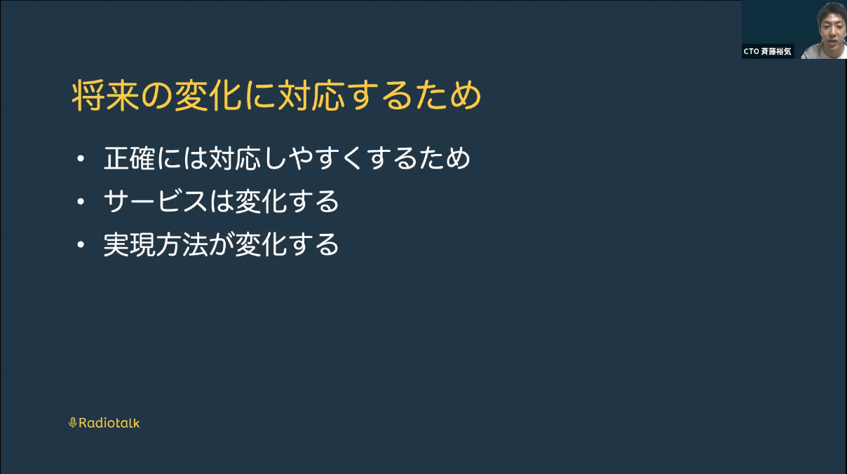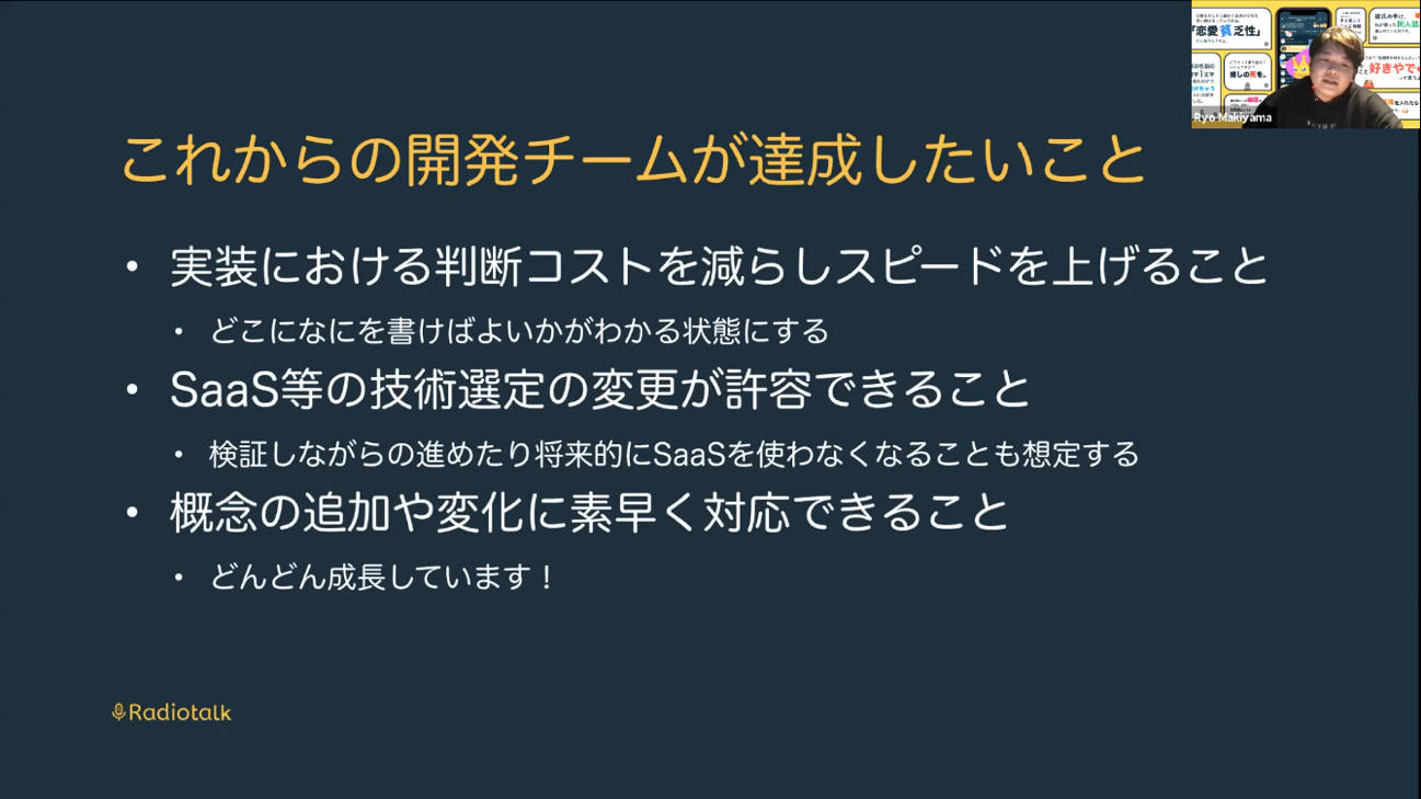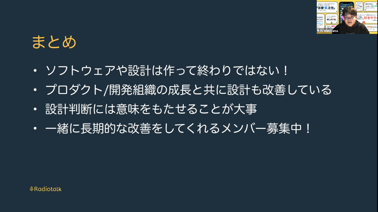 「ソフトウェアは作って終わりではない」というのが、Radiotalkの開発組織全体としての哲学です。プロダクトや開発組織の成長とともに、常に設計も改善を続けていくという気持ちを大事にしています。また、設計判断にはバズワードに飛びつくだけではなく、その導入に意味をもたせることを意識しています。